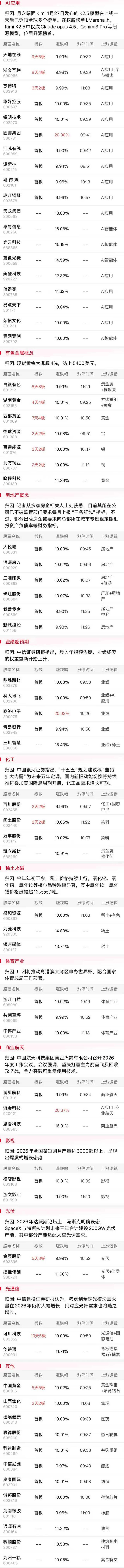 有色金属概念反复活跃,白银有色8连板,西部黄金7天4板,中国黄金5连板,湖南黄金4连板,云南铜业、招金黄金、飞南资源等个股涨幅居前。消息面上,现货黄金价格持续飙涨,站上5400美元/盎司。此外沪铜主力合约日内涨超5%,逼近10.8万元/吨,再创历史新高。