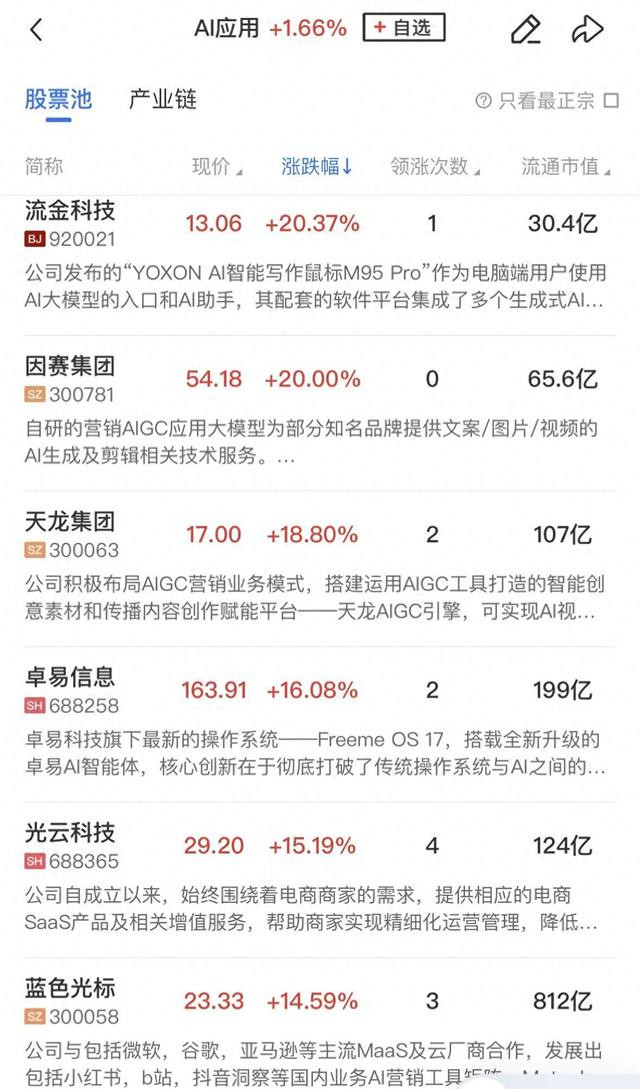 板块上,AI应用全线走强,因赛集团、粤传媒、天地在线、浙文互联等涨停,天龙集团、光云科技、蓝色光标、值得买等涨超10%。