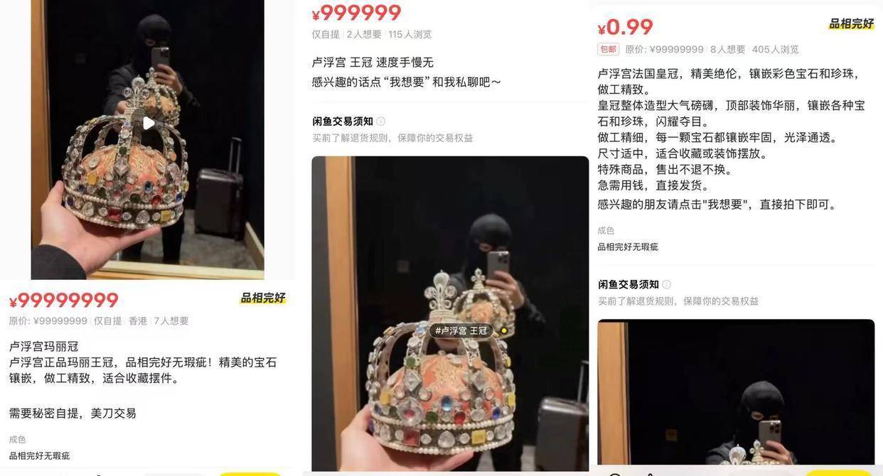 10月22日,记者在二手平台闲鱼上发现,有多个“卢浮宫正品王冠/珠宝”售卖链接,标价从0.99元到9999万元不等。据观察,其商品配图多为卢浮宫近日失窃珠宝,链接文案中还有“9.5新,现货在手、刚取货,低价急出”等描述,在商品评论区,不乏有网友询问“这商品保真吗”。10月23日,潇湘晨报辣椒财经记者以消费者身份咨询了一名卖家,当被问到商品是否能发货时,其给出了否定的答案,并表示“半路被同行抢了”。