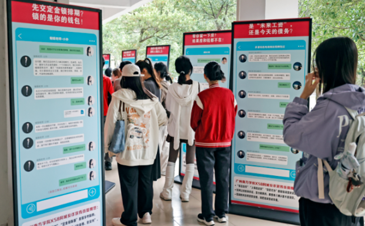 值得注意的是,这场活动的创意,正源自高校反诈宣传员团队的共创与观察。“我们身边也会有同学被骗。骗子取胜的关键不是故事多高明,而是抓住了学生的‘信任点’。”广州南方学院学生、反诈宣传员温远红介绍。在学校保卫处和就业指导中心等老师的共同指导下,他们与58同城反诈团队共同完善了整个体验设计。温远红说,“演一场骗局,写一段真相,反诈语言就这样自然被掌握。”