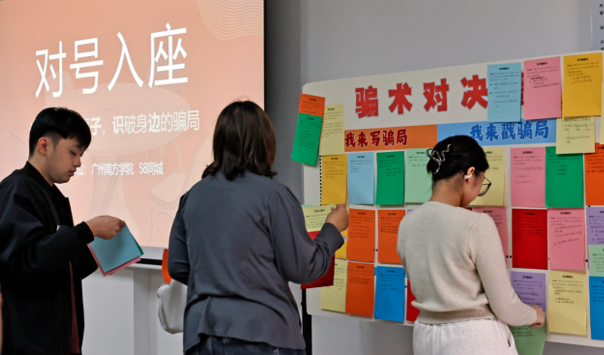 学生们围坐成圈,有人扮演“人事经理”,有人饰演“应聘学生”。这场由广州南方学院联合58同城举办的推理互动游戏,以“看骗局、演骗局、破骗局”为主线,让学生在体验中识别话术陷阱,在共创中形成防骗意识。